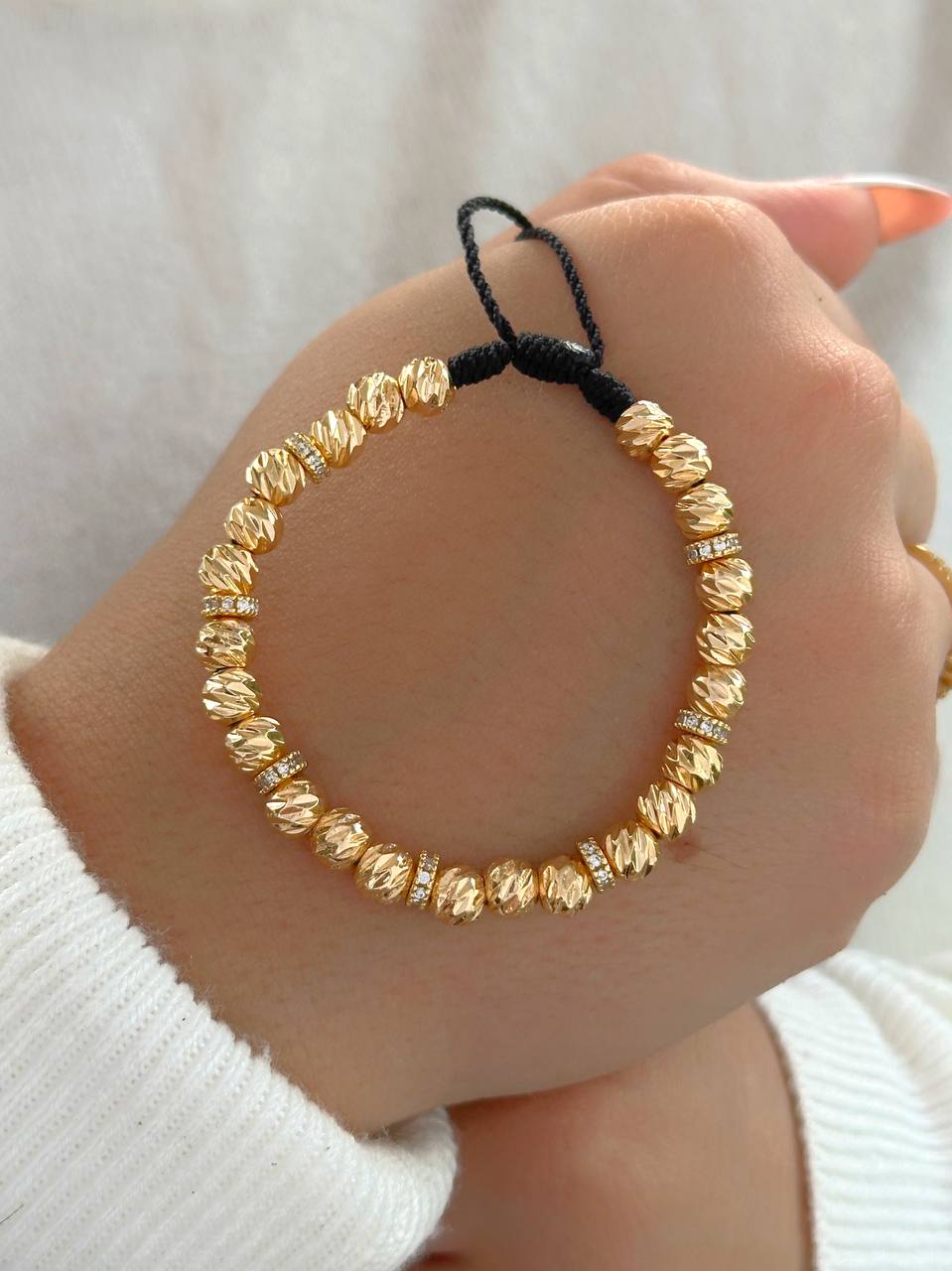 Manilla full balines italianos de 6 mm con delicados rondelles de 5 mm incrustados en circonias. Elaborada en oro laminado de 18K, combina brillo, textura y elegancia en una pieza ajustable que se adapta con estilo a cualquier ocasión.