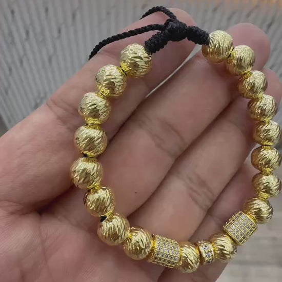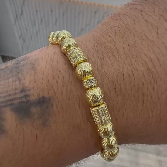 Impactante manilla diamantada de 8mm en oro laminado de 18K, con elegantes centros en cilindro que aportan fuerza y estilo. Complementada con exclusivo herraje Luxo engastado en circonias, ideal para quienes buscan distinción en cada detalle